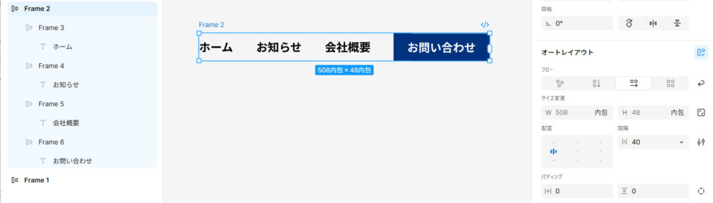 - 1.ナビゲーションの各項目(「ホーム」「お知らせ」など)をオートレイアウトでボタン化します。