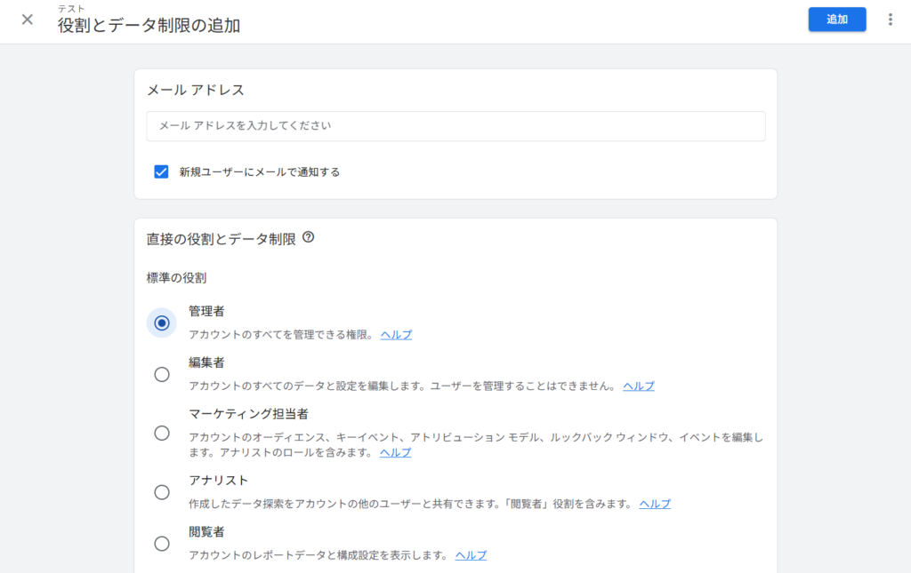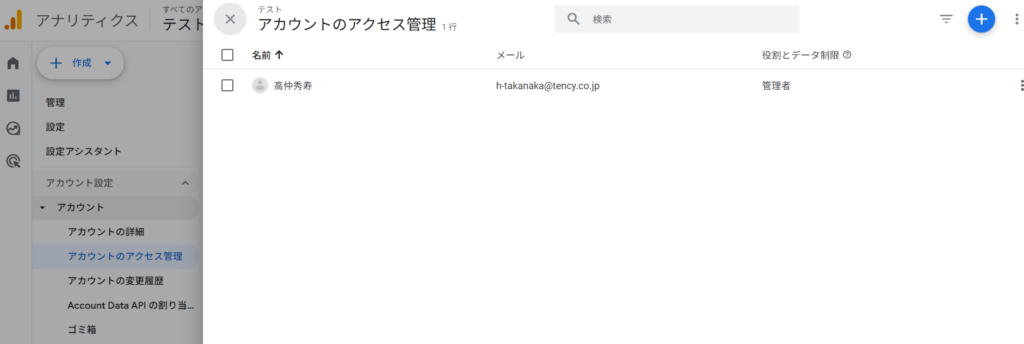 制作会社側でもデータを閲覧できるように、アカウントを追加してください。アカウント設定のアカウント>アカウントのアクセス管理 を開くと、閲覧できるアカウントの一覧が表示されます。右上の+ボタンから、ユーザーを追加し、メールアドレスを追加してください。SEO分析サポートのために弊社にアクセス権限を追加する場合は、「管理者」の役割で追加してください。