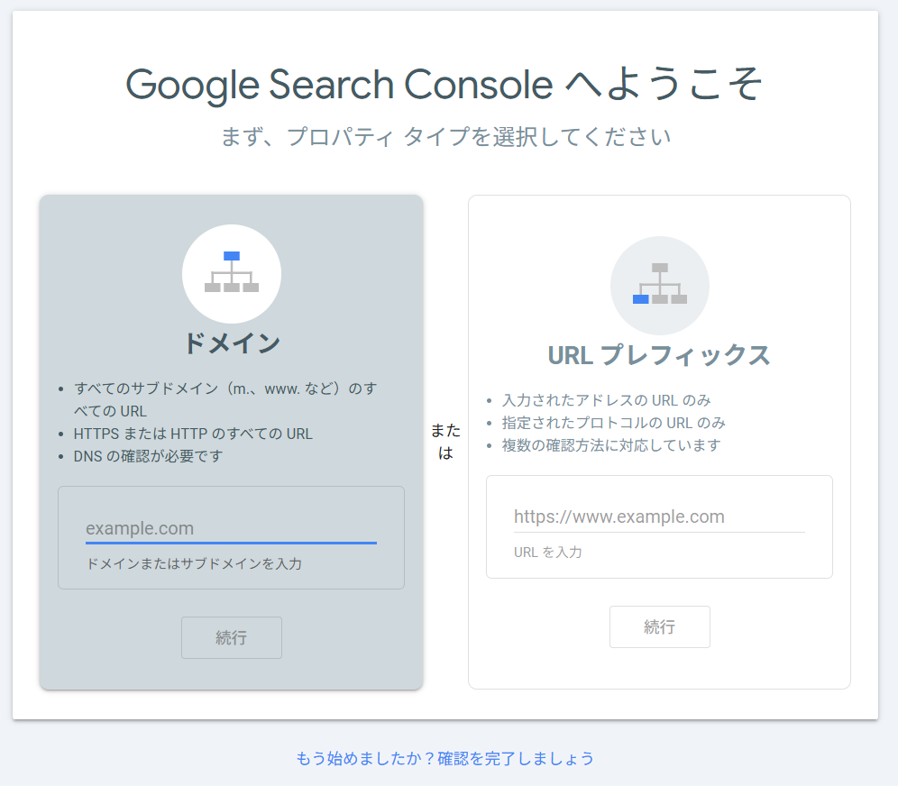 過去にGoogle Search Consoleのプロパティを設定したことが無ければ、上記の新規に登録する画面が表示されます。特に指示が無い場合は、「ドメイン」で設定したいURLのドメインを入力しましょう。この際、ドメイン単位での設定となるので、記入例にあるようにhttps://www. は不要です。
