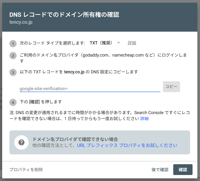 DNSレコードでのドメイン所有権の確認、が表示されたら、③のコピーを行って、サーバー管理会社に①のレコードタイプトセットで伝えてください。サーバー管理会社がDNSレコードにTXTレコードを追加したとの報告があったら、確認ボタンを押します。確認ができるまで数時間~最大24時間程度かかる可能性があるので、うまくいかないようであればしばらく時間をおいてください。