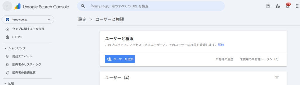 GA4と同様に、Google Search Consoleにおいても、制作会社側でもデータを閲覧できるようにアカウントを追加してください。メニュー左下にある「設定>ユーザーと権限>ユーザーを追加」で、フル権限で追加ください。