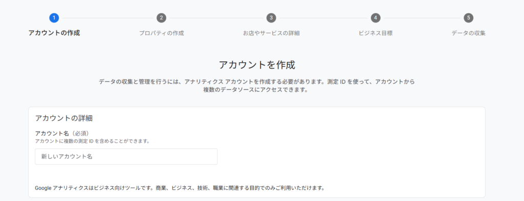 アカウント名は、任意の文字列(アナリティクスを設置するサイトの名称など分かりやすいもの)を入れてください。その下の「アカウントのデータ共有設定」は、デフォルトのままで良いと思いますが、気になる人はチェックを外しても良いかもしれません。