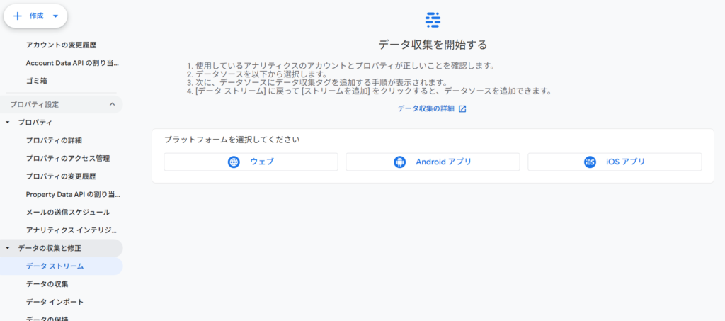 メニューの「データの収集と修正」から、データストリームの設定を行います。データ収集を開始するメニューにおいて、ウェブからの収集を開始しましょう。