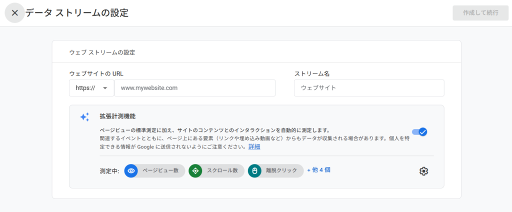ウェブサイトのURLとストリーム名を入力したら、右上の「作成して続行」ボタンを押します。