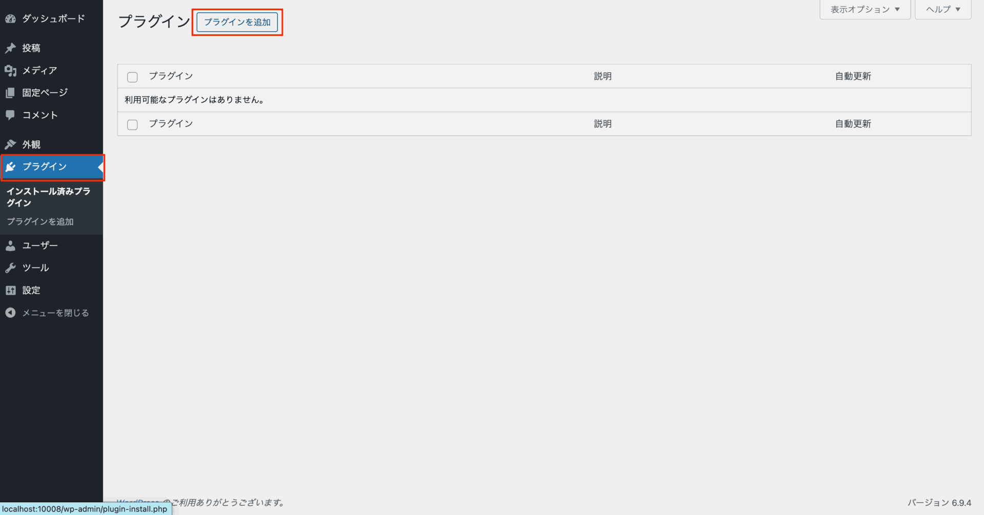 - WordPress管理画面の左メニューから 「プラグイン」>「新規追加」 をクリック。