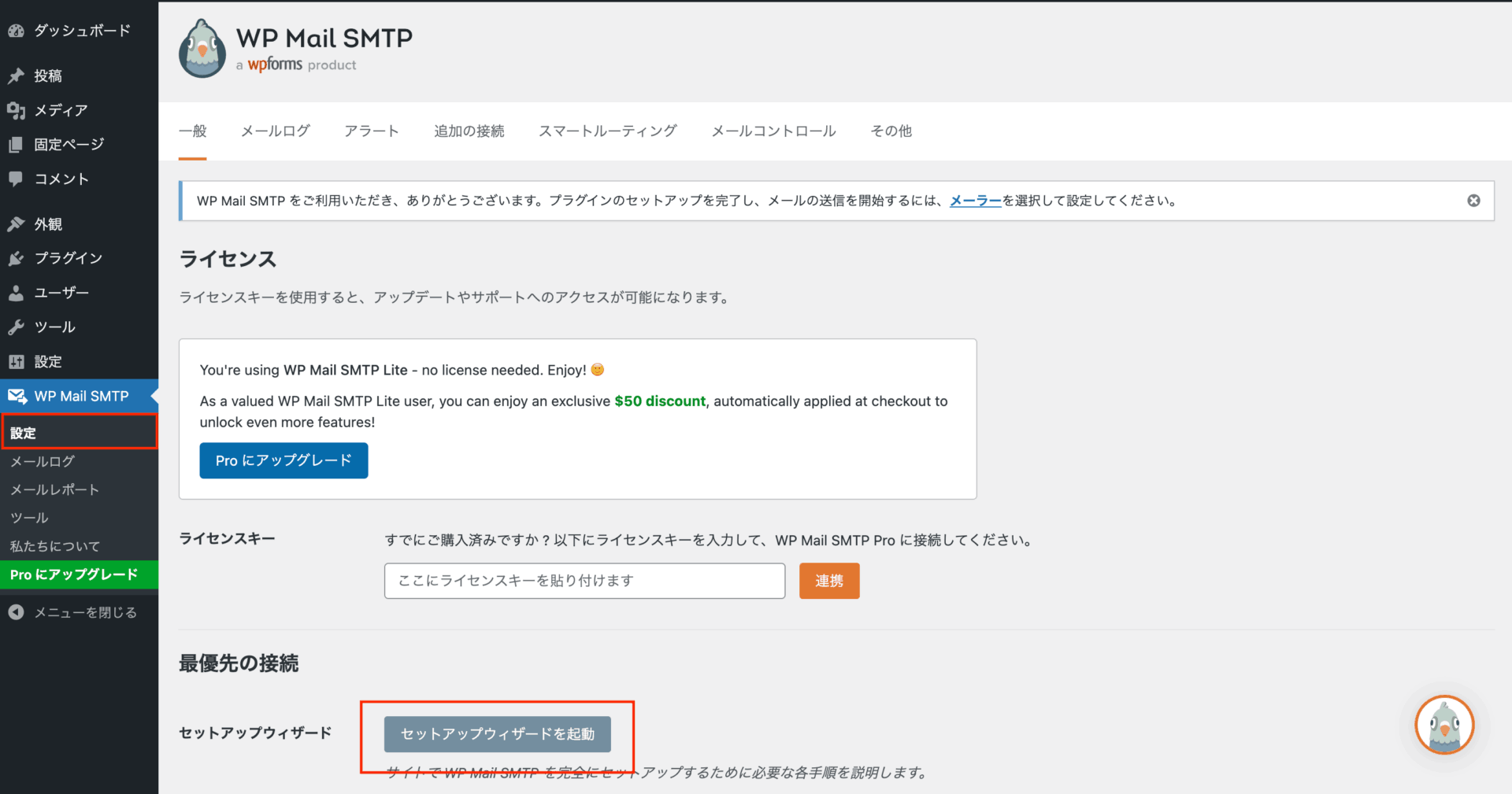 有効化すると「セットアップウィザード」が始まります(始まらない場合は、メニューの「WP Mail SMTP」>「設定」から「セットアップウィザードを起動」をクリックしてください)。