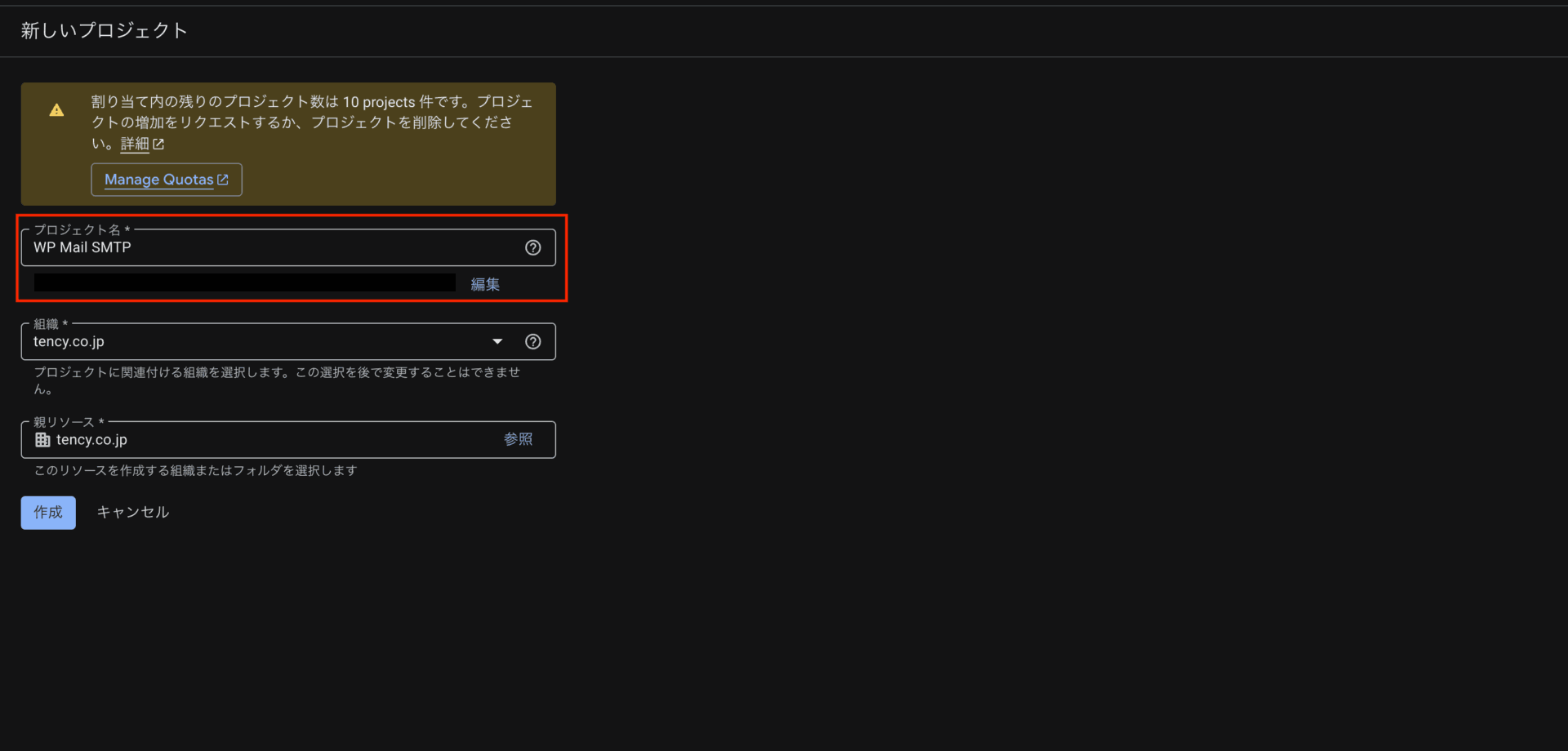- Google Cloud Console にアクセスし、画面左上の「プロジェクトの選択」>「新しいプロジェクト」で新規プロジェクトを作成します。プロジェクト名は「WP Mail SMTP」を入力してください。