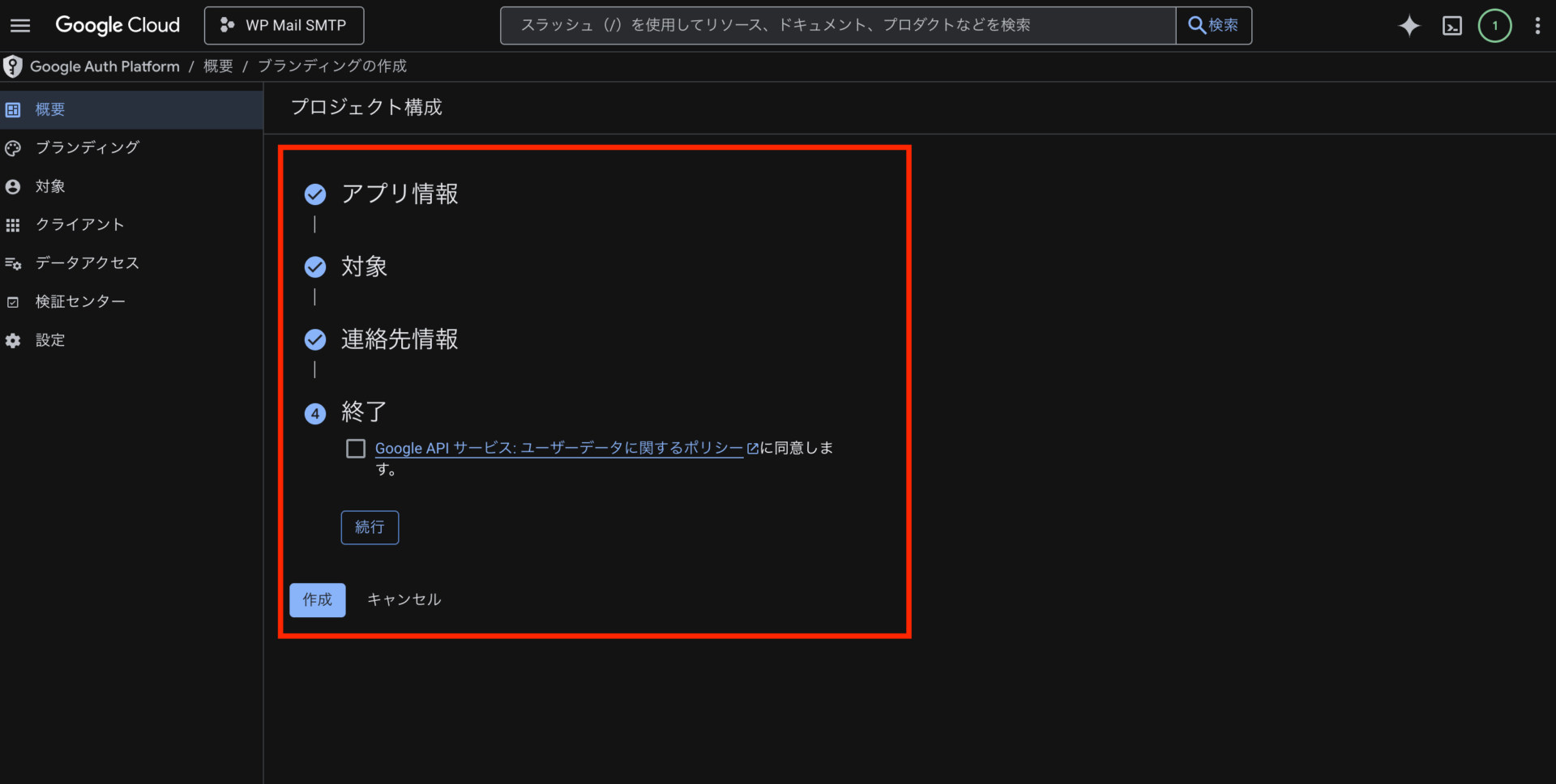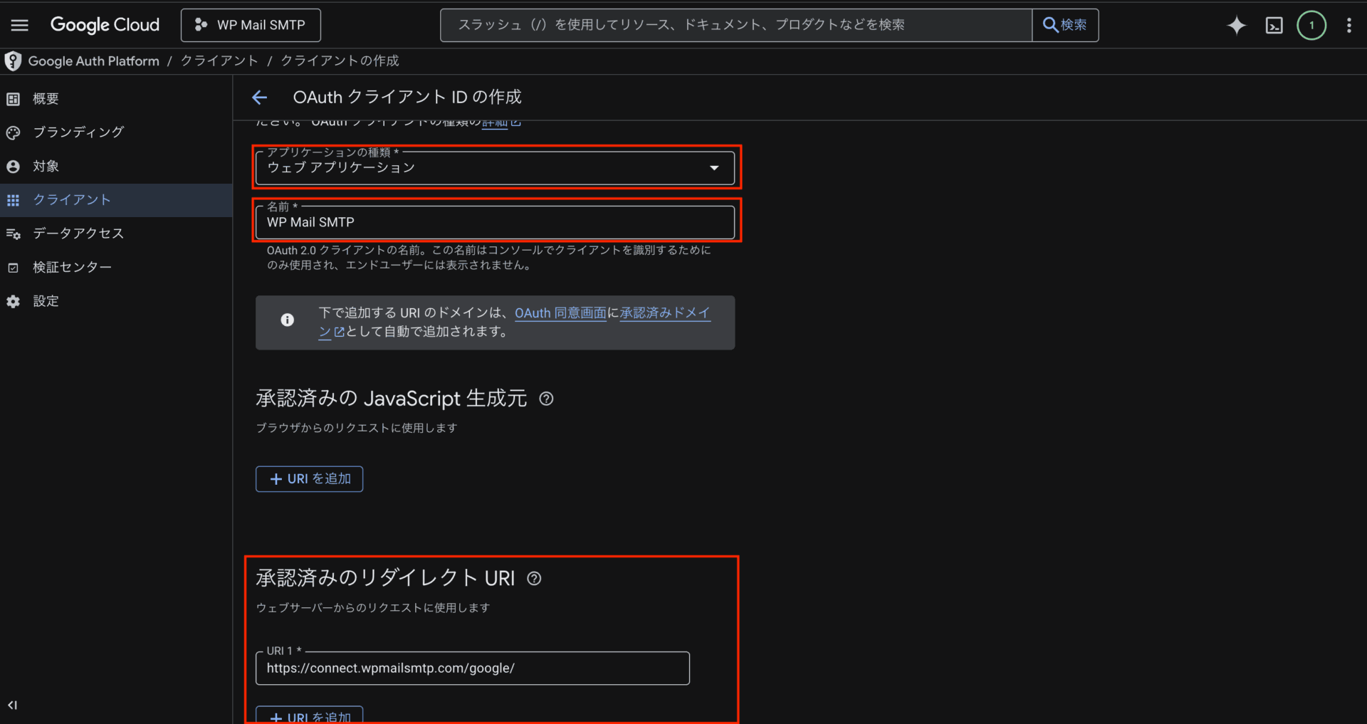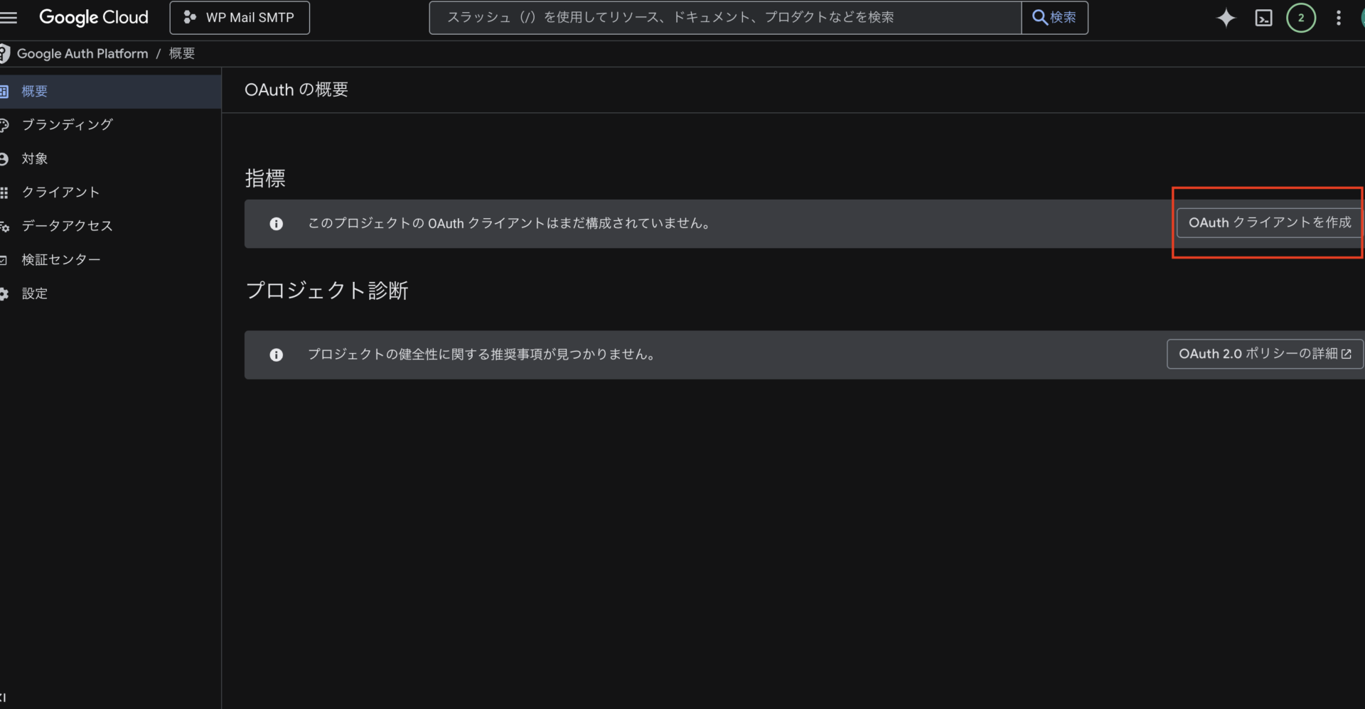 アプリ名などは任意の名前で大丈夫です。(WP Mail SMTP など分かりやすい名前を推奨します) - アプリ情報を登録後、「OAuthクライアントを作成」をクリック