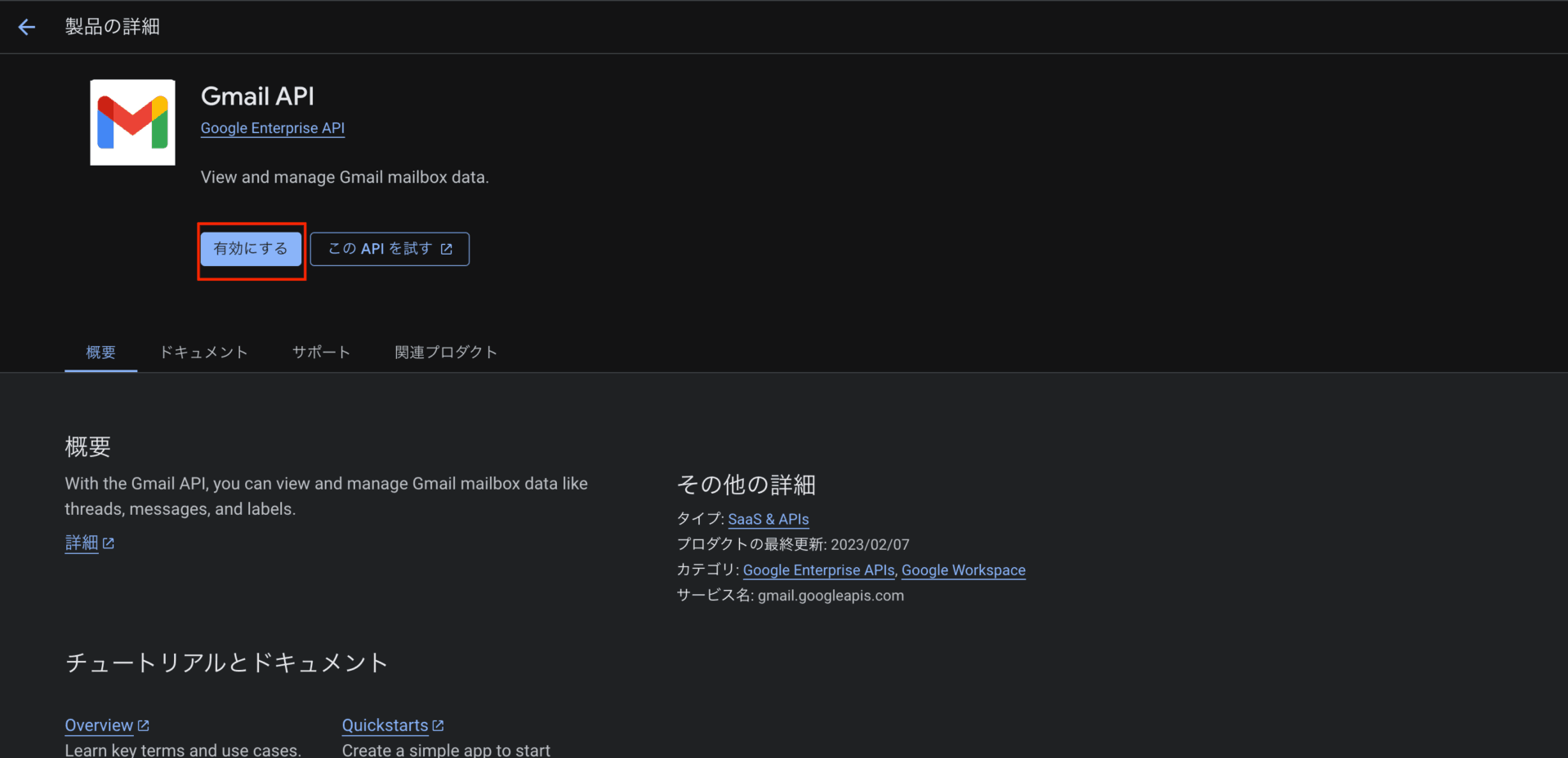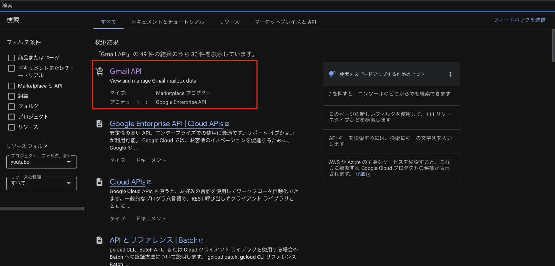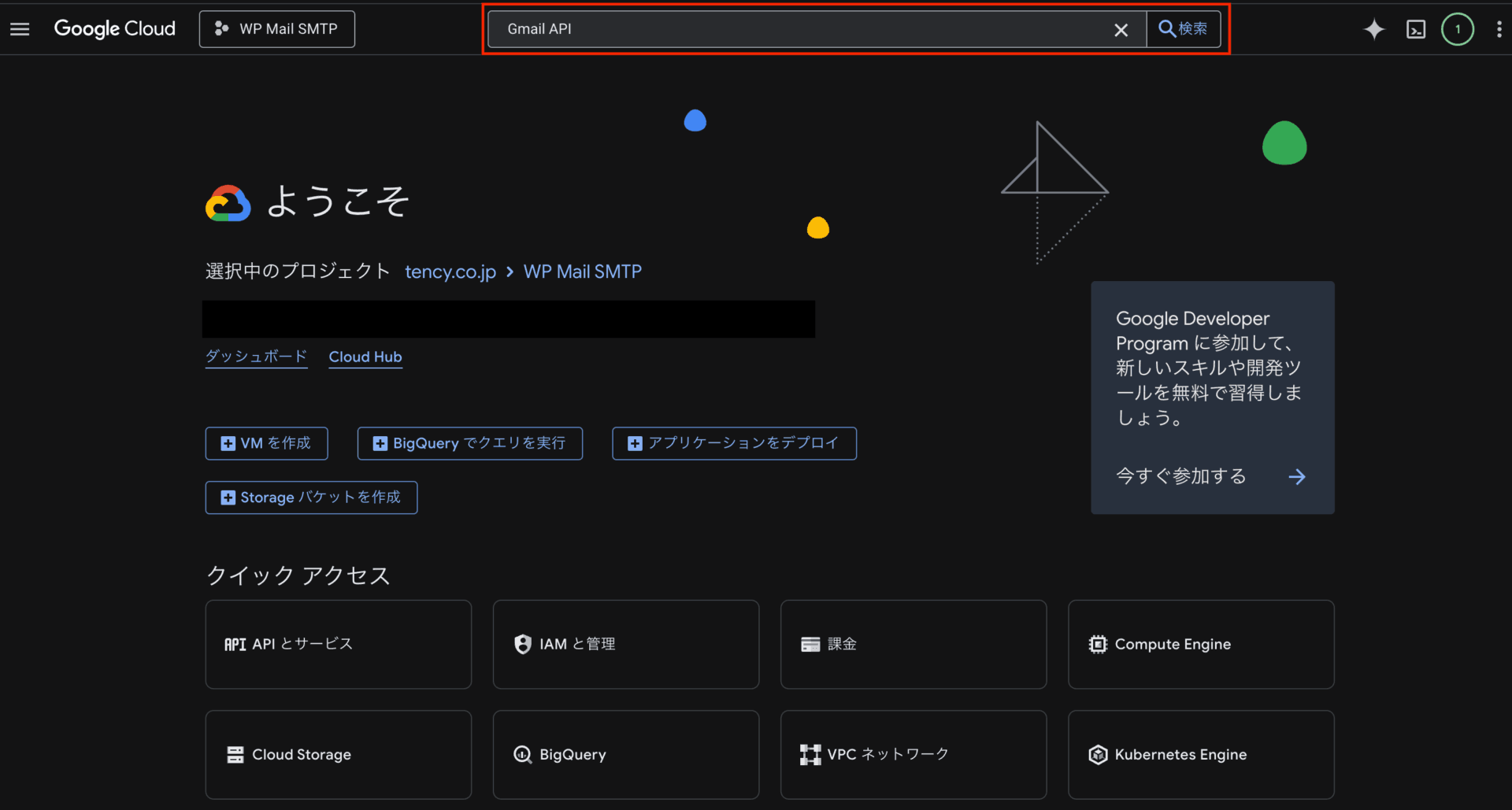 ※「WP Mail SMTP」になっていない場合は、プロジェクト名の箇所をクリックして「WP Mail SMTP」を選択してください。 - 画面上部の検索窓で「Gmail API」を検索して有効化します。