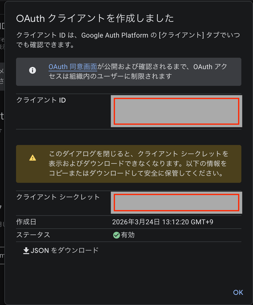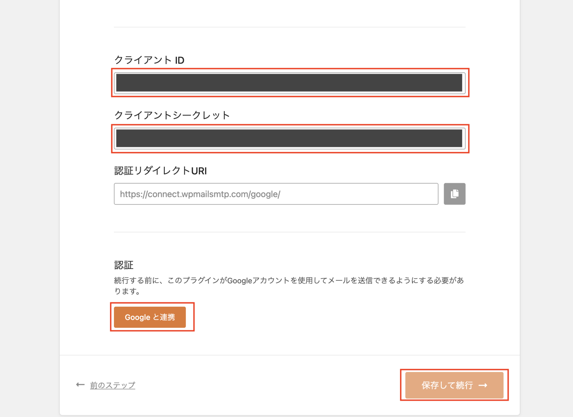 - 取得した 「クライアント ID」 と 「クライアントシークレット」 をそれぞれの入力欄に貼り付けます。
