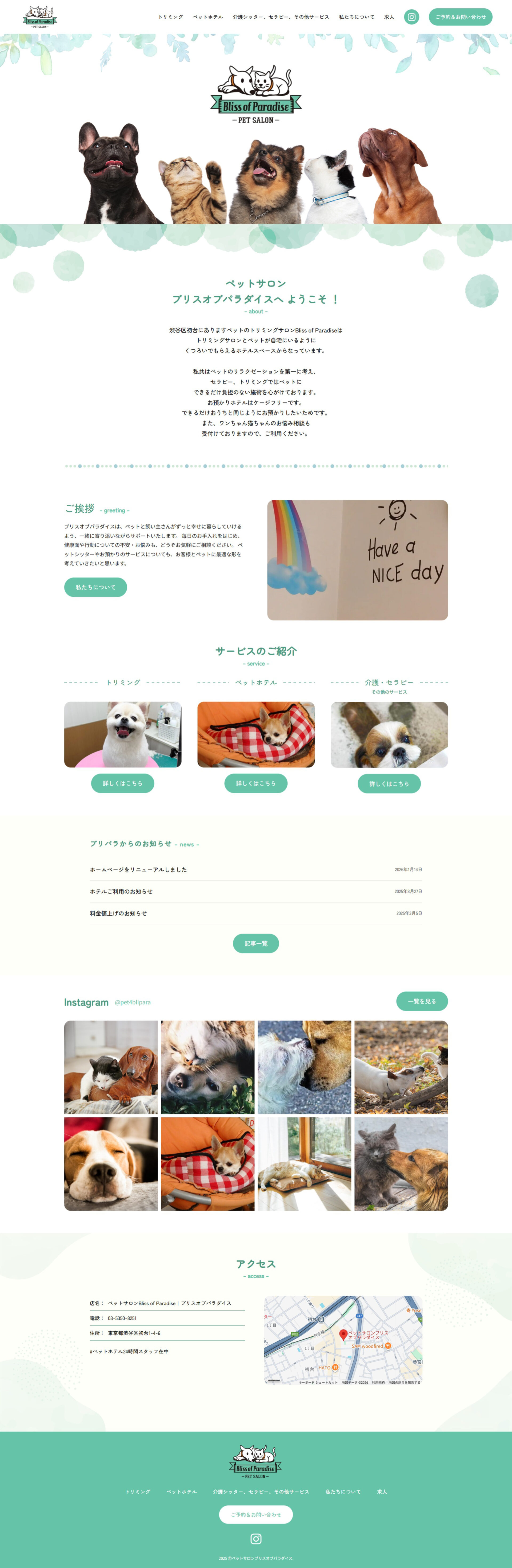 ペットと飼い主さんがリラックスできるサロンの雰囲気が伝わるよう、やさしいグリーンをベースに、水彩のあしらいを取り入れたデザインにしています。トリミングやペットホテルに加え、セラピーサービスがある点も意識し、全体的にやわらかく、癒しを感じられるトーンで統一。
